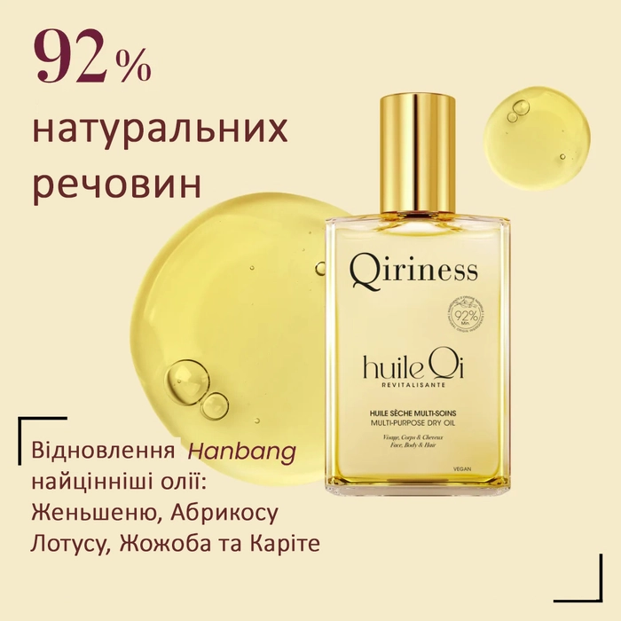 Багатофункціональна суха олія для шкіри обличчя, тіла та волосся. Комплексний ритуал догляду, натхненний корейською медициною Ханбанг. Відновлююча суха олія Qi Revitalizing Oil має терапевтичний вплив що надає шкірі зволоженого, оновленого та ідеально збалансованого результату. Відновлююча суха олія Qi, збагачена потужними активними речовинами – це багатофункціональний засіб, призначений для відновлення балансу шкіри та волосся. Олія інтенсивно живить, зберігаючи природний баланс шкіри, огортає шкіру ніжною вуаллю, даруючи їй м'якість та зволоження, не залишаючи жирної плівки. Ідеальне поєднання корейських традицій та французького косметичного досвіду, покликане подарувати вашій шкірі енергію, сяйво та комфорт. Олія має вишуканий аромат цитрусових, квітів і мускусу перетворює кожне застосування в момент розслаблення та спокою. Концентрат благополуччя та ефективності. Екстракт священного лотоса: відновлює баланс шкіри, сяйво, тонус та життєву силу. Стимулює регенерацію та активність клітин шкіри, запобігає утворенню зморшок, уповільнює процеси старіння. Активний антиоксидант, захищає шкіру від УФ-променів, особливо показаний для пошкодженої, подразненої шкіри, екземи та дерматитів, має дренажні властивості.