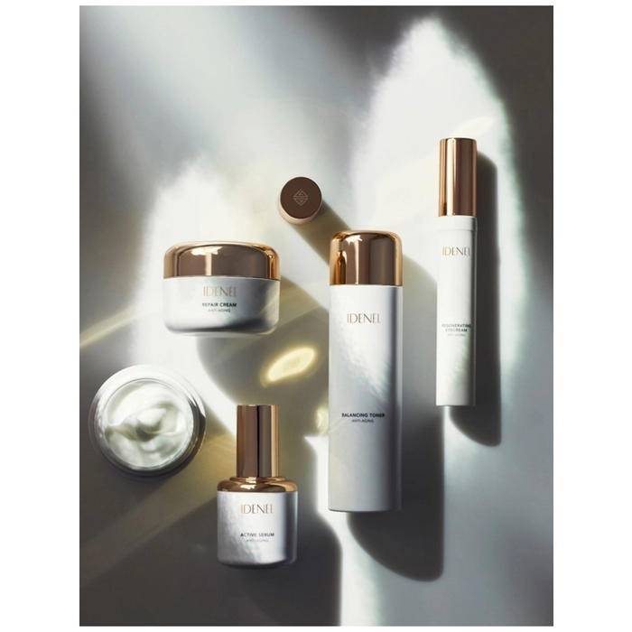 Крем для надання пружності та усунення зморшок шкіри контуру очей Idenel Regenerating Eye Cream. Шовковистий і м'який крем забезпечує зволожуючий та омолоджуючий догляд за шкірою контуру очей та носогубними складками, містить дорогоцінні інгредієнти мікроголок Raphitox™ які допомагають усунути зморшки та підвищити еластичність шкіри, а також зробити шкіру контуру очей гладкою та яскравою завдяки багатим зволожуючим. Мікроголки проникають у базальний шар шкіри, стимулюють безперервне клітинне оновлення, впливають на міжклітинний простір, зміцнюючи еластинові та колагенові волокна, сприяють збереженню здоров'я та молодості шкіри. Дія крему забезпечує регенерацію та відновлення глибоких шарів епідермісу завдяки багатому та натуральному складу рослинних екстрактів, комплексу пептидів, амінокислот, протеїнів, гіалуронової кислоти. Олія Макадамії – містить велику кількість вітаміну Е, групи В, фолієвої кислоти, поліненасичених жирних кислот. Чинить антиоксидантну, пом'якшувальну, поживну дію. Комплекс протеїнів сої та пшениці прискорює процес оновлення клітин, забезпечує регенерацію шкіри на клітинному рівні, дозволяє шкірі відновити свій тонус та сяйво. Екстракт Бакопа (Брахмі) забезпечує антиоксидантну, омолоджуючу, в'яжучу, ранозагоювальну, протизапальну, охолоджувальну, тонізуючу дію. Стимулює вироблення шкірою колагену, активізує процеси обміну в клітинах, покращує кровообіг, омолоджує шкіру на клітинному рівні, зменшує появу дрібних ліній, зморшок, покращує тон шкіри та її еластичність. Пептидний комплекс відтворює частину білків і ланцюжок з амінокислот, що є факторами росту клітин шкіри. Стимулює механізми клітинного поділу, ці пептиди допомагають шкірі створювати клітини, необхідних молодості шкіри. Трипептид міді - на даний момент це один з найефективніших, як наслідок, широко включених до косметичних рецептур пептидів. GHK-Cu має загоювальний та антиоксидантний ефект, стимулює синтез структурних білків, хондроїтину, декорину та глікозаміноглюканів. Оновлює та ревіталізує шкіру. Аденозин має сильну протизапальну дію, суттєво прискорює загоєння тканин, покращує мікроциркуляцію, надає стимулюючу дію на фібробласти. Ніацинамід покращує бар'єрну функцію шкіри, має антиоксидантний ефект, а anti-age ефект пов'язаний зі збільшенням синтезу колагену. Комплекс з амінокислот відновлює та зміцнює захисні функції шкіри, регулює рівень вологи (амінокислоти є одним з головних компонентів зволожуючого фактора), відновлюють пружність та еластичність епідермісу, контролюють процес відлущування ороговілих клітин.